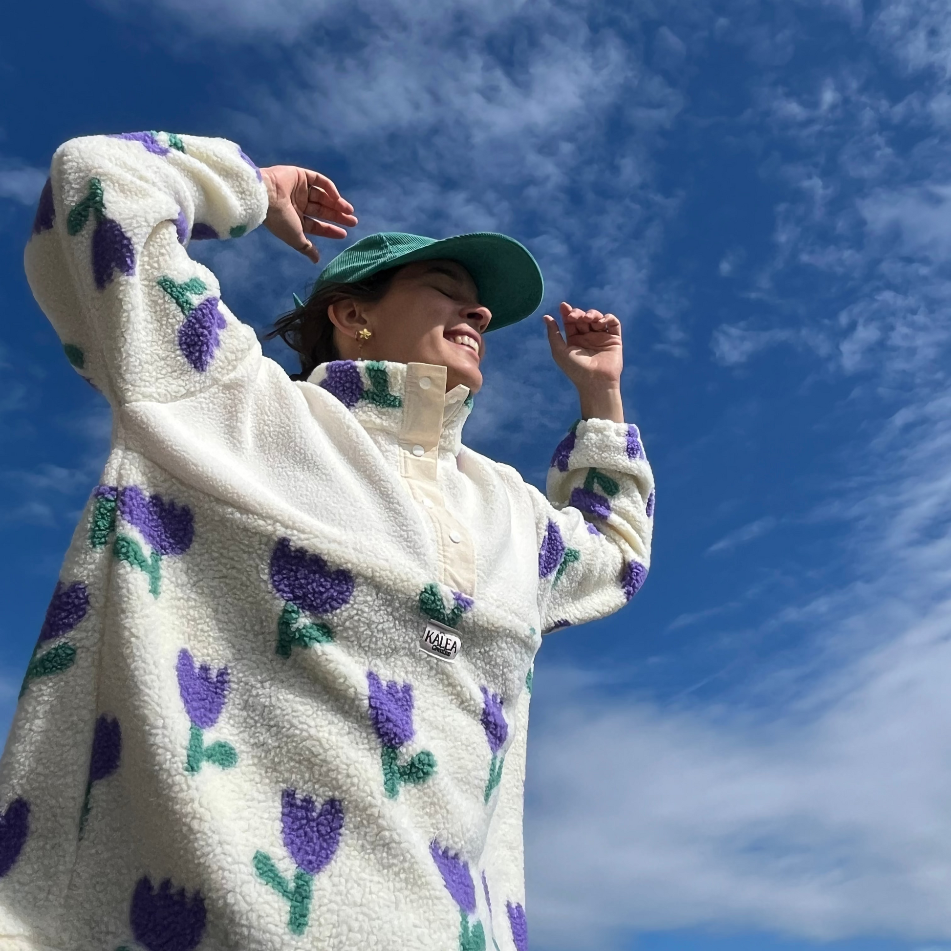Cette Polaire est un modèle unique. Cousue dans un tissu sherpa tulipes & du sherpa blanc. Une polaire oldschool, fleurie, aux couleurs douces, parfait pour une soirée fraîche sur la plage ou une journée en montagne.