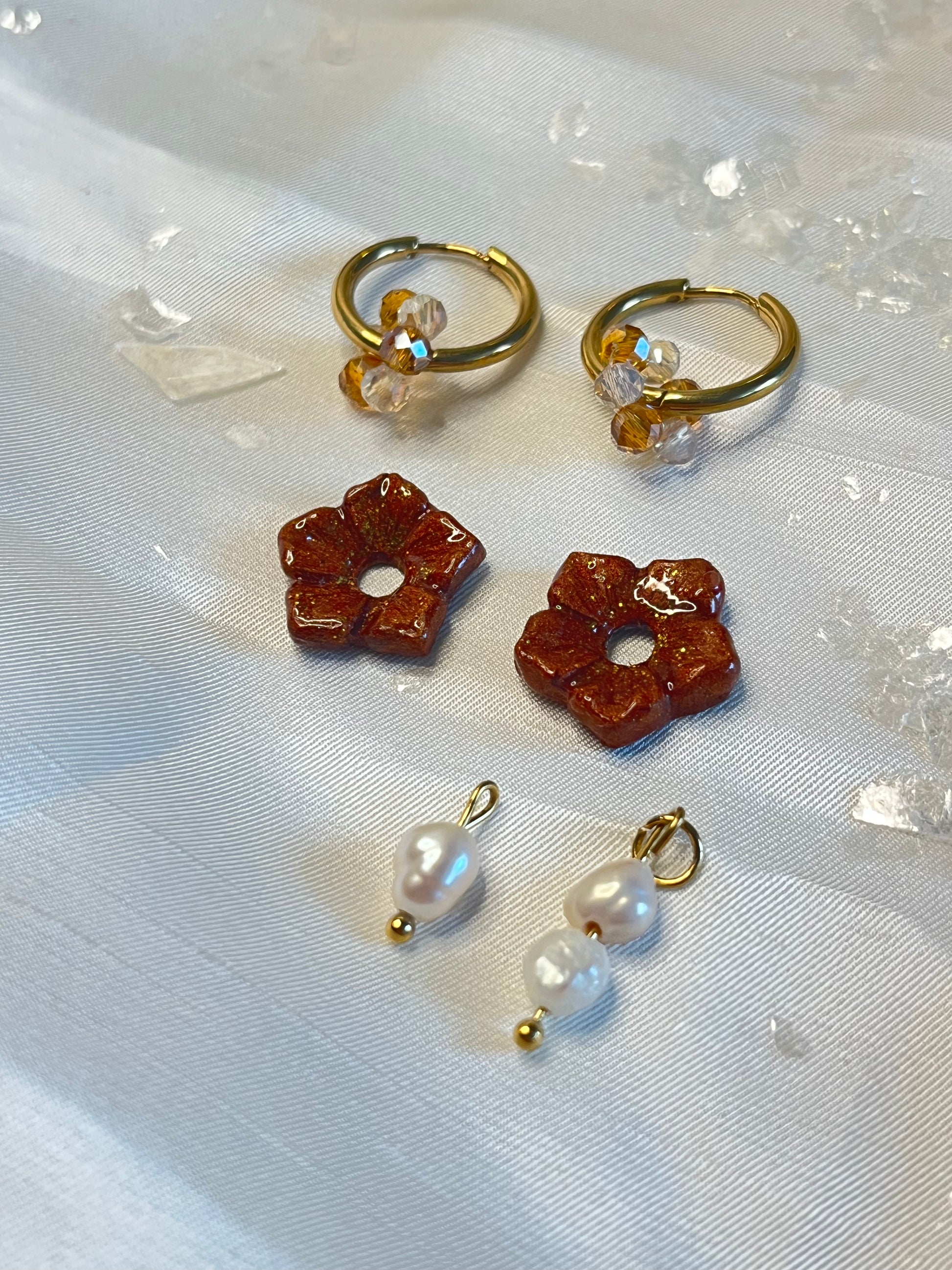 Ce pack comprend une paire de créoles accompagnée de trois paires de pendentifs faits main, à interchanger selon ton humeur et tes envies.
